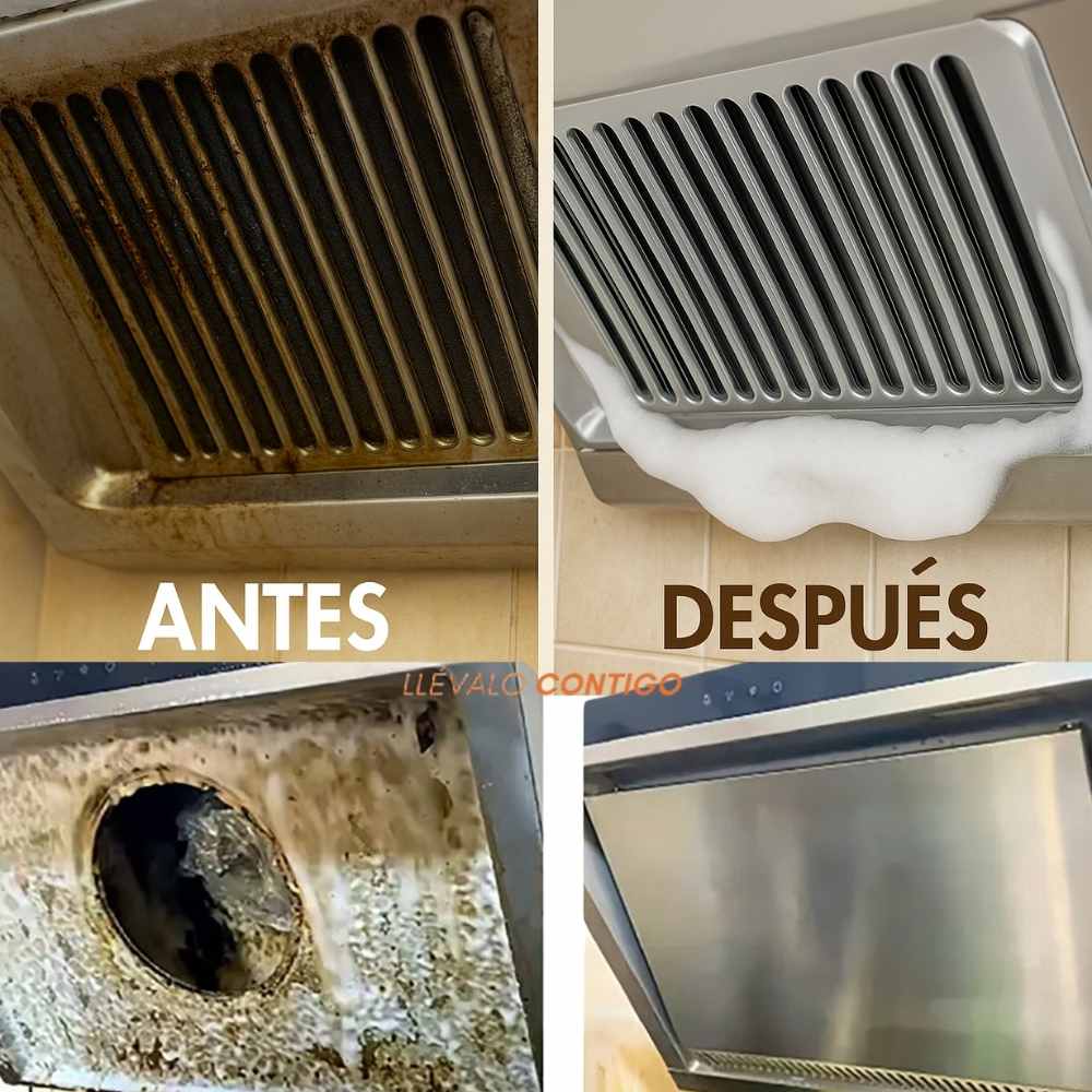 - En segundos empiezas a ver como la grasa se desprende. Ten en cuenta que si la zona no se ha limpiado por años o tiene mucha grasa acumulada, puedes dejar actuar durante más tiempo o hacer doble limpieza.